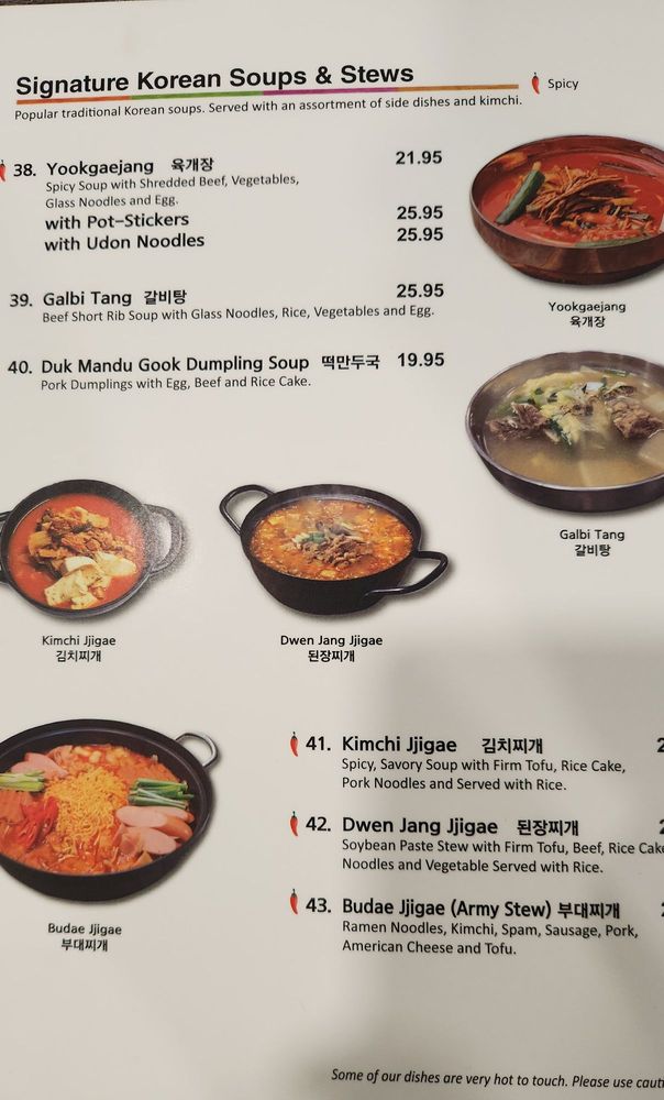 Spicy. Soybean paste stew with tofu, beef, rice cake, noodles, and vegetables served with rice