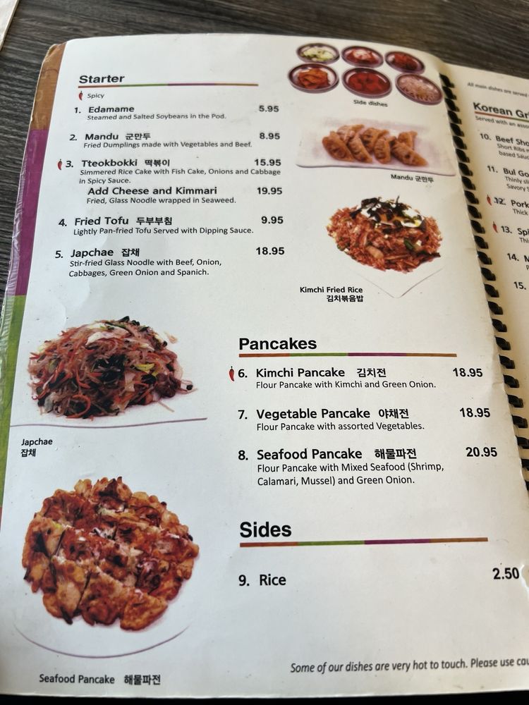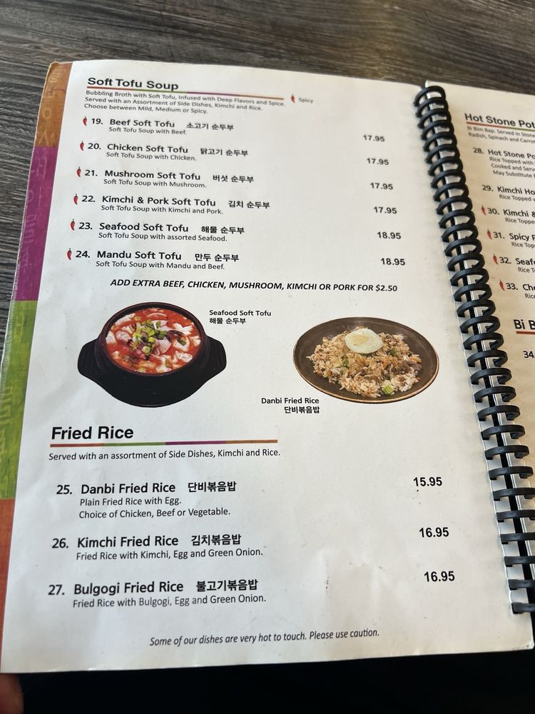 Spicy. Spicy, savory soup with firm tofu, rice cake, noodles, and served with rice